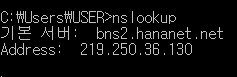 nslookup 명령어를 사용 하면 현재 사용하고 있는 DNS서버를 확인할수있다.