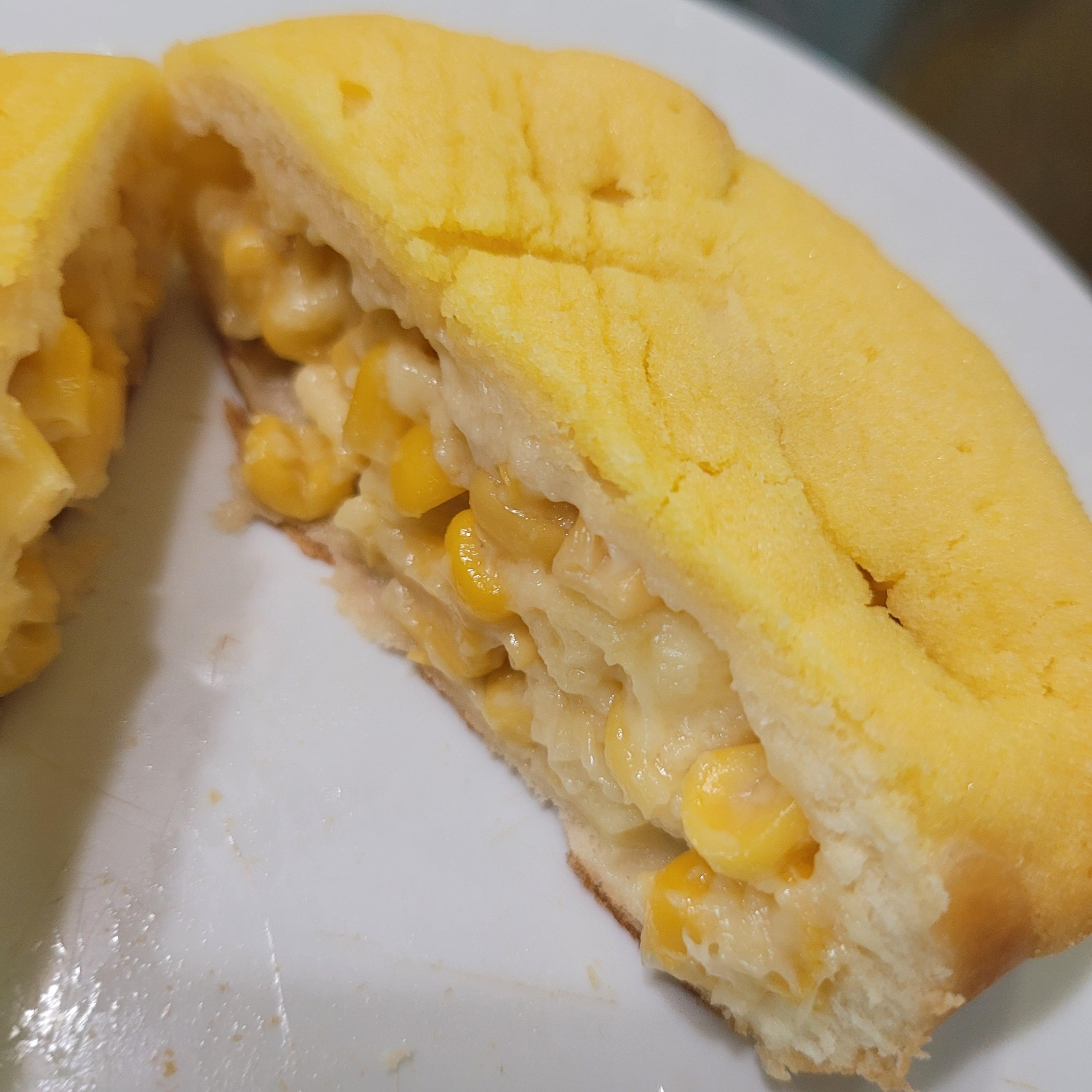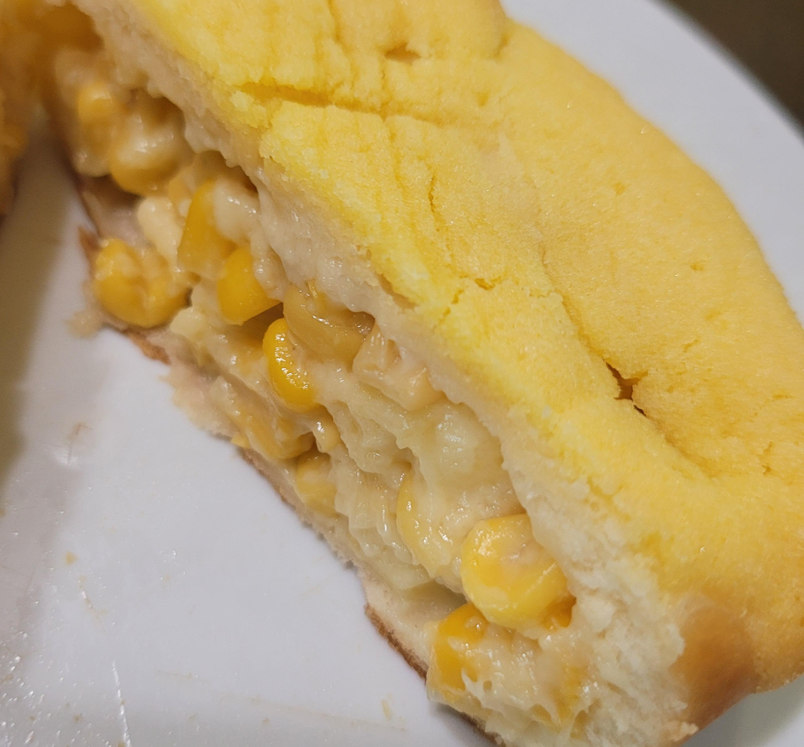 모양은 아래 사진과 같이 옥수수랑 소스가 섞여 있고 표면은 소보루?